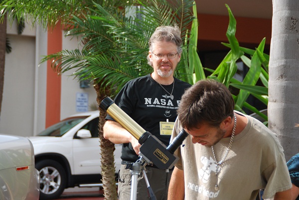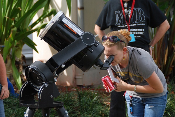 But as the Sun went down, the action turned to the sky. We had a great turn out with a steady stream of Halo characters, Goths and more all interested to look at the universe. The bright lights of downtown St. Pete (and a Saturday nite soccer game just across the road) restricted us to fairly bright targets, i.e. the waxing gibbous Moon and a rising Jupiter. Hey, the limiting magnitude allowed us to just pick out the Summer Triangle high overhead, and Aldebaran next to Jupiter. Even Albireo was a tough grab, akin to doing astronomy from the Las Vegas strip! Still, we star-partied into the wee dawn hours, discussing libration, interstellar travel, and much more. A big thanks to Tanja from Star Splitter Adventures for providing star maps and a wealth of astronomical knowledge.