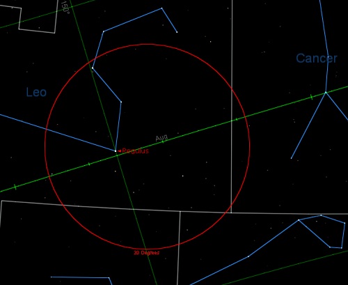 The position of the Earth’s shadow in the constellation Leo during closest approach.